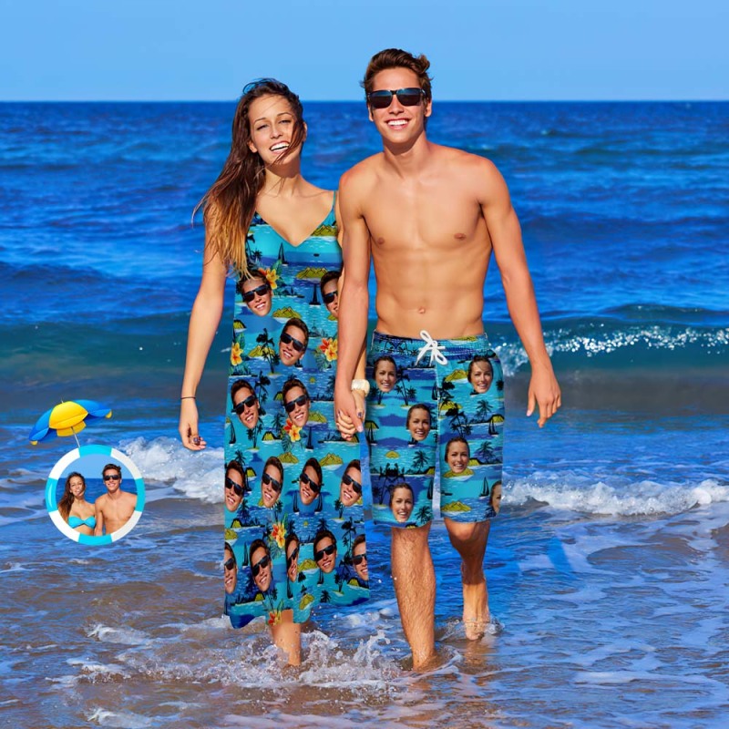 Passende Outfits Für Paare Mit Individuellem Gesicht Und Kokosnussbaum-strandkleidungsset