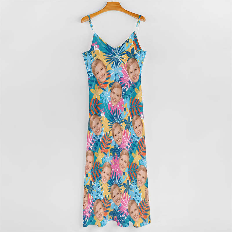 Benutzerdefiniertes Gesicht Langes Kleid Im Hawaiianischen Stil, Buntes Blumen-schlingenkleid