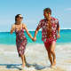 Benutzerdefiniertes Gesicht Im Hawaiianischen Stil Rotes Langes Kleid Und Hemd Paar Outfit Weiße Blumen Design