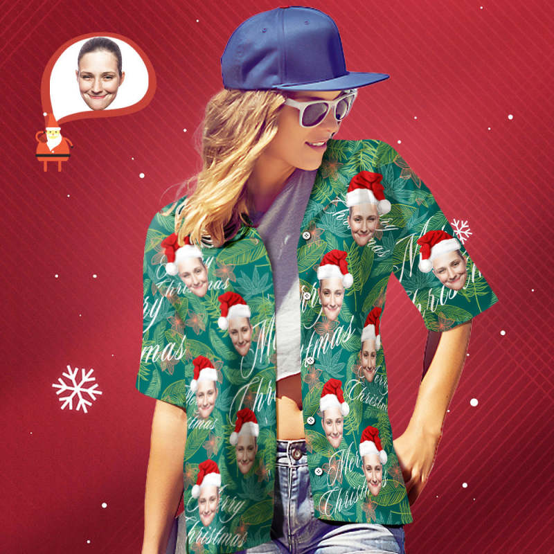 Benutzerdefiniertes Gesicht, Personalisiertes „frohe Weihnachten“-hawaii-hemd Für Damen Mit All-over-print-blättern