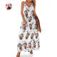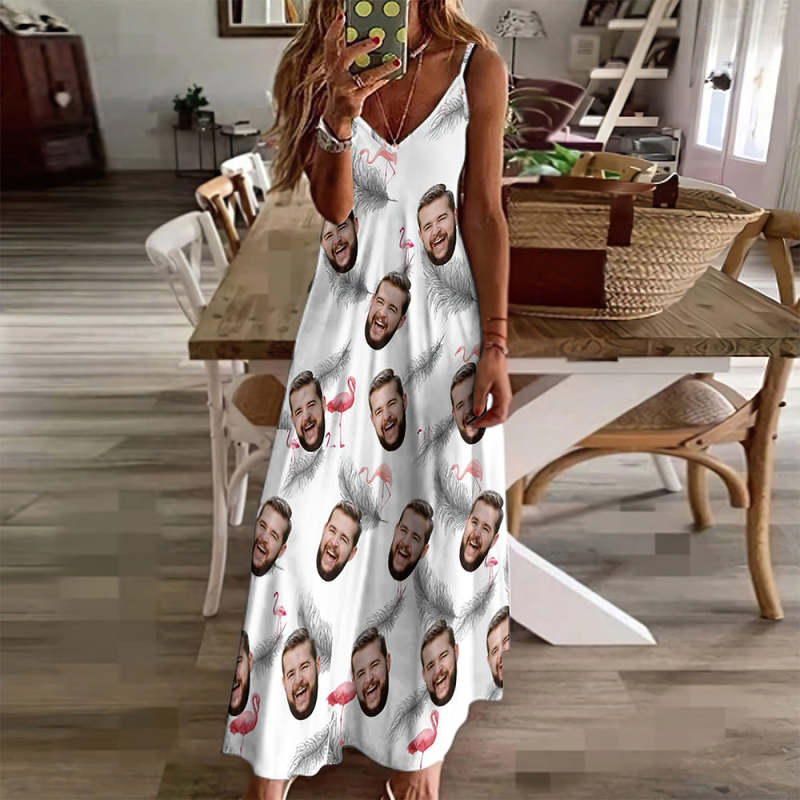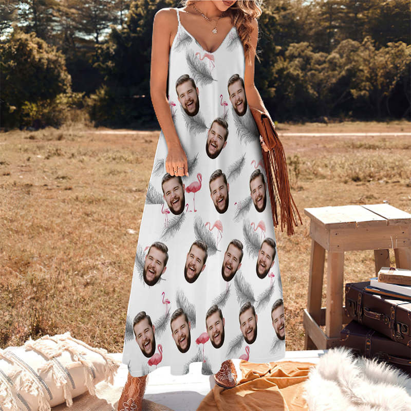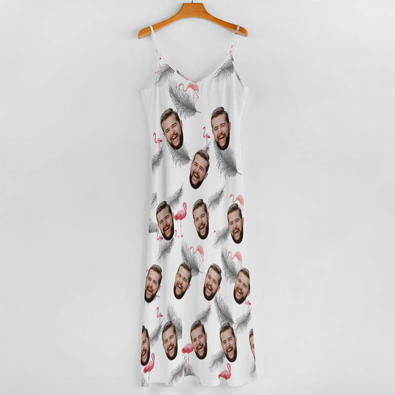 Benutzerdefiniertes Gesicht Hosenträger Langes Kleid Im Hawaiianischen Stil Feder Und Flamingo