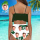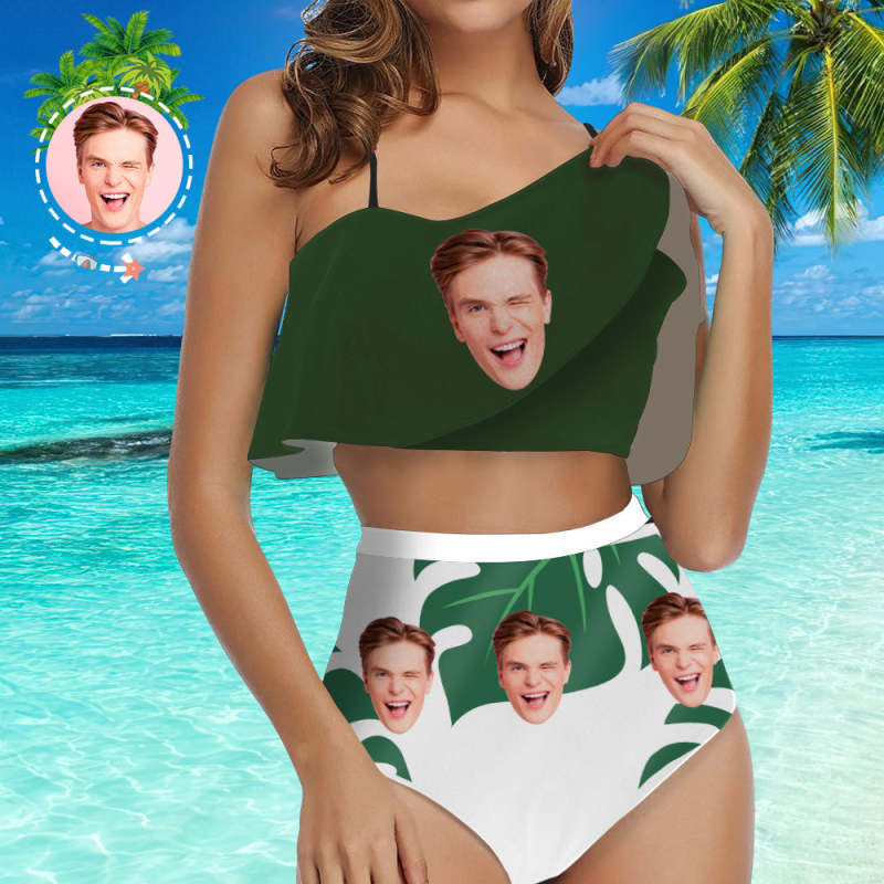 Custom Face Badeanzug Mit Rüschen Und Palmblättern, Hoch Taillierter Bikini