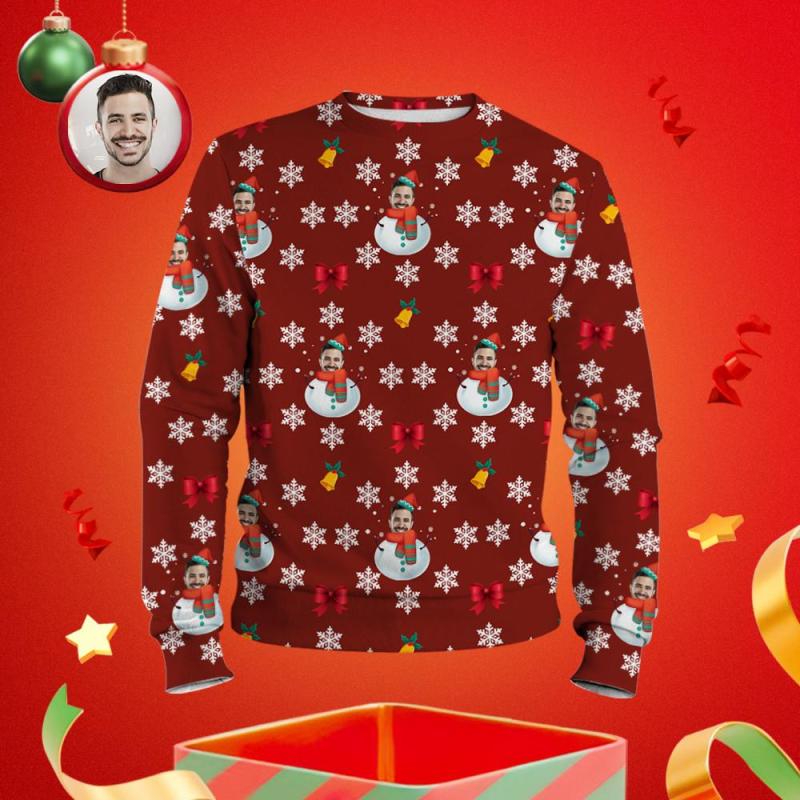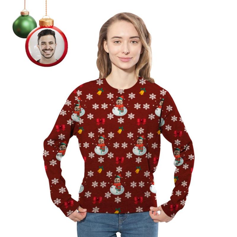Benutzerdefiniertes Gesicht Unisex Weihnachten Sweatshirt Schneemann mit deinem Gesicht Lässige Schneeflocke Gedrucktes Foto Hemd mit Rundhalsausschnitt